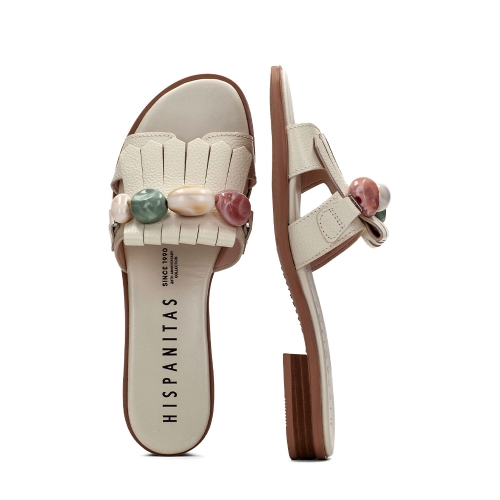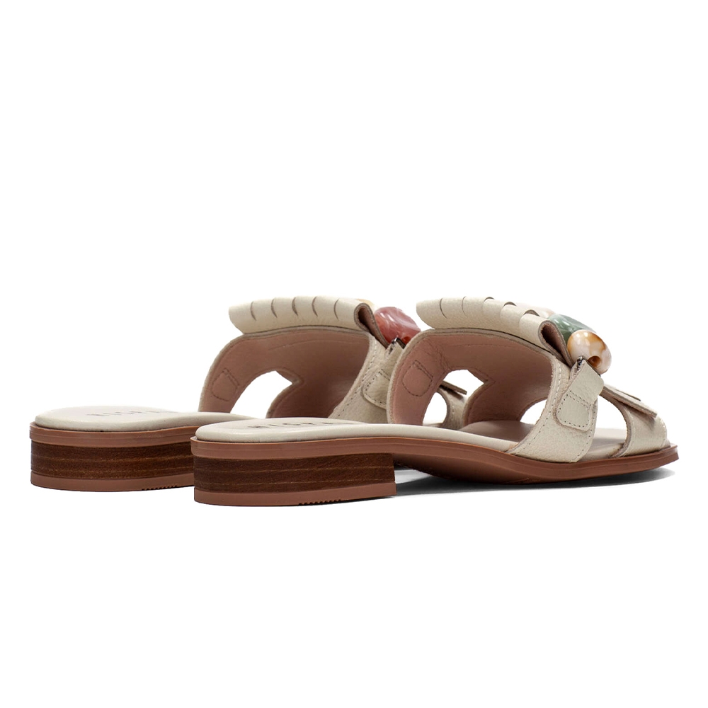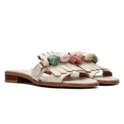 Sandalia plana de diseño elegante con adorno de flecos y cuentas en el empeine.