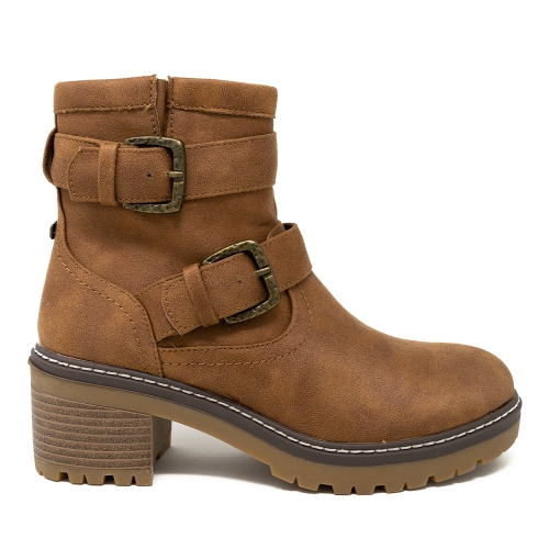 Botín de tacón Doris Mustang para mujer, modelo casual de color taupe de puntera redondeada con adorno de doble hebilla en el empeine y al tobillo. Cierre de cremallera en la parte interior de la caña para más comodidad. Un modelo cómodo por su tacón, ideal para llevar con vaqueros o vestidos, como tu prefieras.