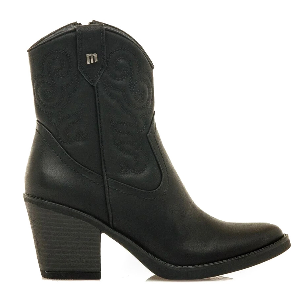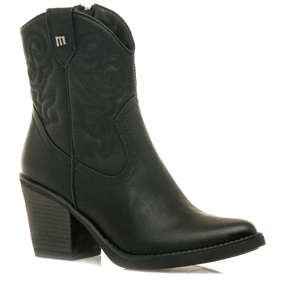 Botines de tacón de color negro para mujer, modelo Tijuana de Mustang. Su diseño de estilo cowboy con tacón ancho y bordado decorativo en la caña resaltan su inspiración western. Incluye puntera afilada y cierre lateral con cremallera para facilitar el calce. El tacón inclinado añade altura sin renunciar a la comodidad, ideal para combinar con jeans ajustados o vestidos fluidos. Una opción versátil que suma carácter a cualquier look diario.