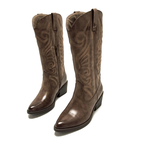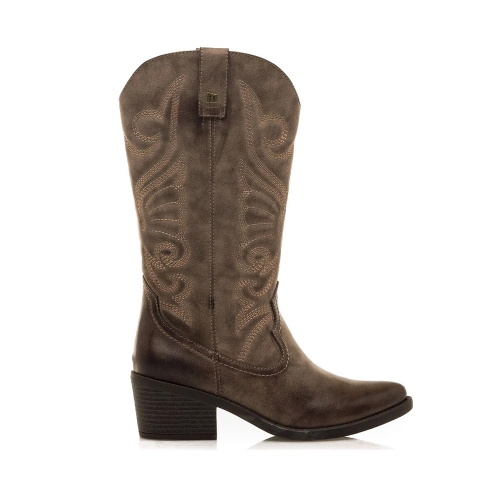 Bota cowboy de color moka para mujer, modelo Tanubis de Mustang. Este diseño de caña media resalta por sus bordados decorativos en hilo claro que contrastan con el acabado desgastado del corte. La puntera ligeramente afilada y el tacón medio ancho aportan un equilibrio entre estilo y comodidad. Con cremallera interior para facilitar el calce y tiradores superiores que refuerzan su estética western, es una opción ideal para darle un aire vaquero a tus looks.