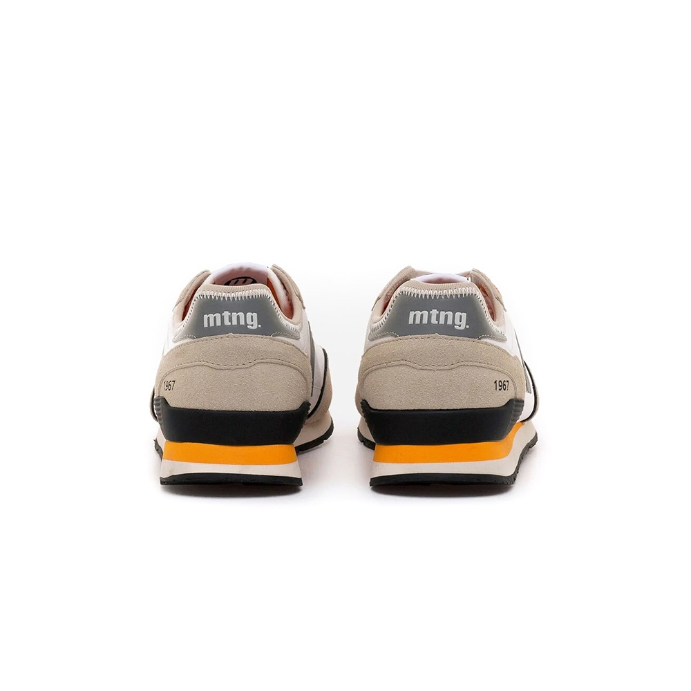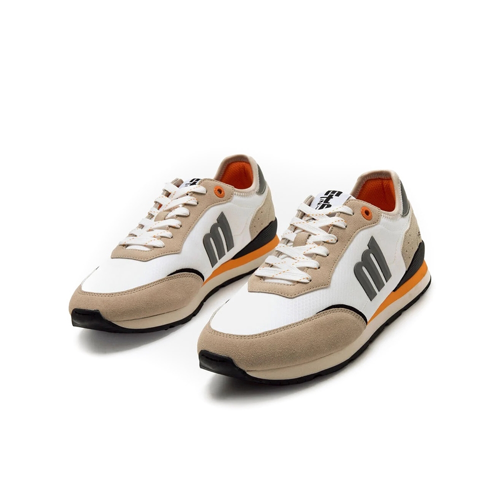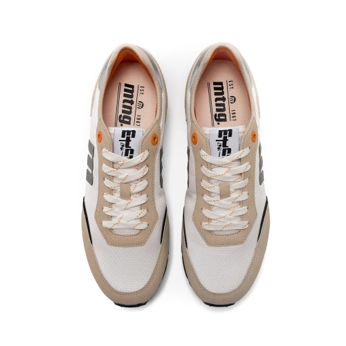 Zapatillas para hombre de la marca Mustang, modelo Joggo Classic de estilo retro running de color blanco con detalles beige. El diseño combina tonos neutros con acentos en gris, negro y naranja para un look deportivo con personalidad. Incluye el logo lateral en relieve y plantillas con tecnología Starfit, que mejoran la comodidad en cada paso. Gracias a su construcción ligera y diseño versátil, es una opción cómoda perfecta para quienes buscan funcionalidad con un toque moderno. Con certificado VEGANO sellado por INESCOP, el cual garantiza que la naturaleza química principal del material no se corresponde con fibras de origen animal.