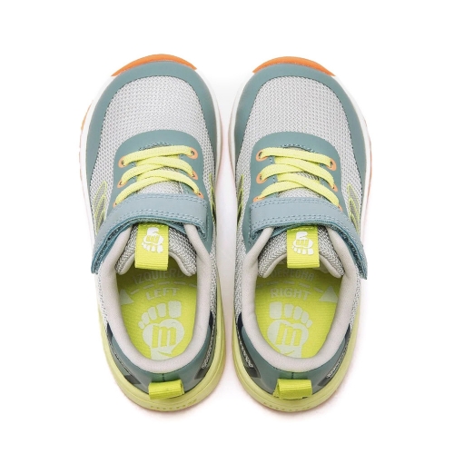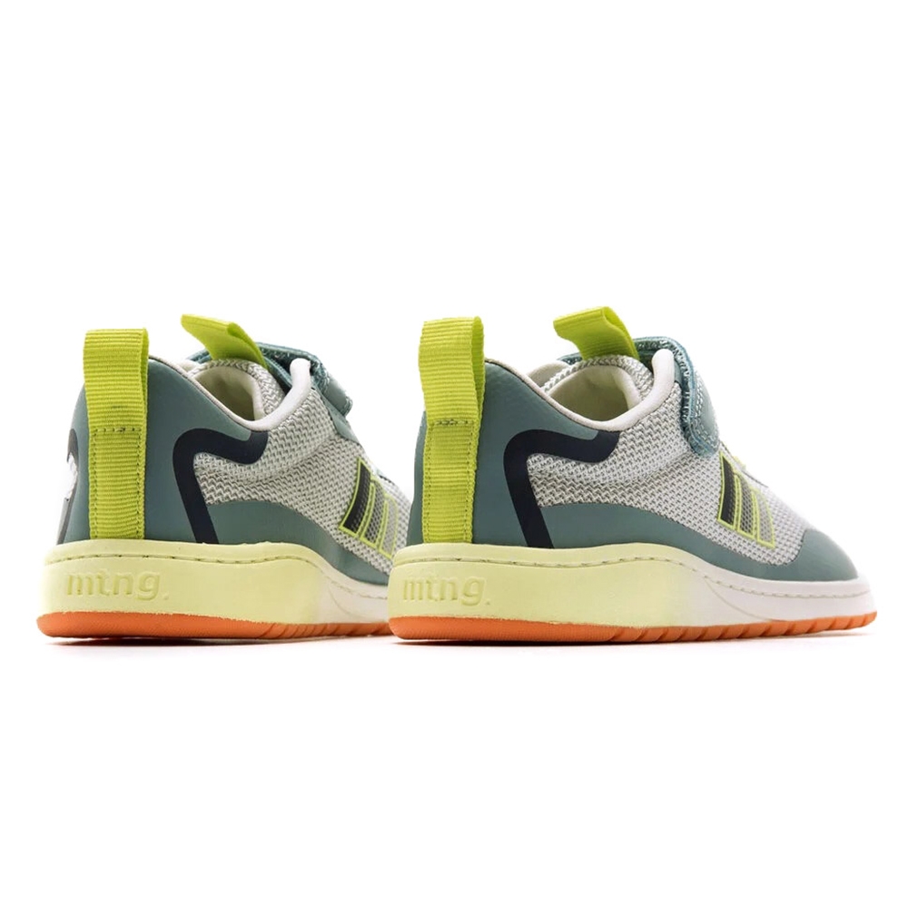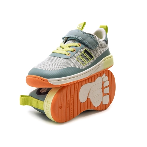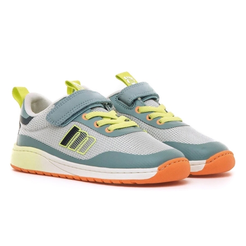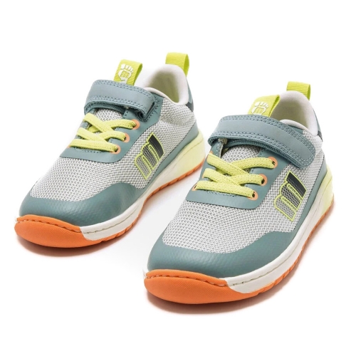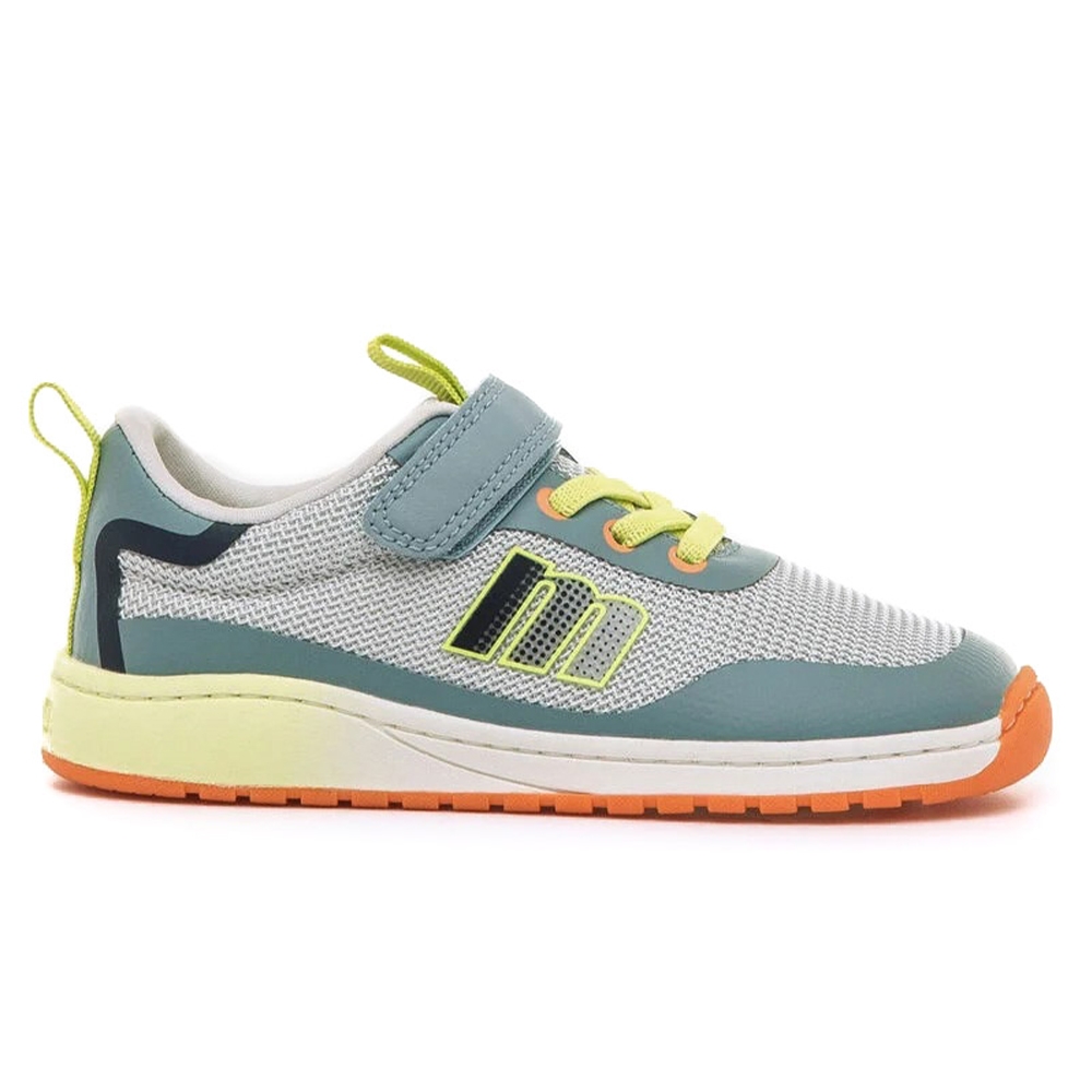 Zapatilla barefoot de color gris con detalles en verde marino, amarillo flúor y naranja de la marca Mustang, modelo Free. Su diseño lavable combina tejido de rejilla con refuerzos en puntera y talón para mayor durabilidad. Incorpora cordones elásticos y cierre adhesivo que facilita el calce, mientras que la lengüeta y talonera con tirador ayudan a ponerlos con autonomía. Diseñado y desarrollado especialmente en colaboración con el Dr. Juanjo López, traumatólogo deportivo e infantil, para respetar el desarrollo natural del pie del niño y la niña. Gracias a su puntera ancha permite el libre movimiento de los dedos dentro del zapato. Las plantillas extraíbles facilitan comprobar si la talla del calzado es la correcta para tu hijo. Con certificado VEGANO sellado por INESCOP, el cual garantiza que la naturaleza química principal del material no se corresponde con fibras de origen animal.