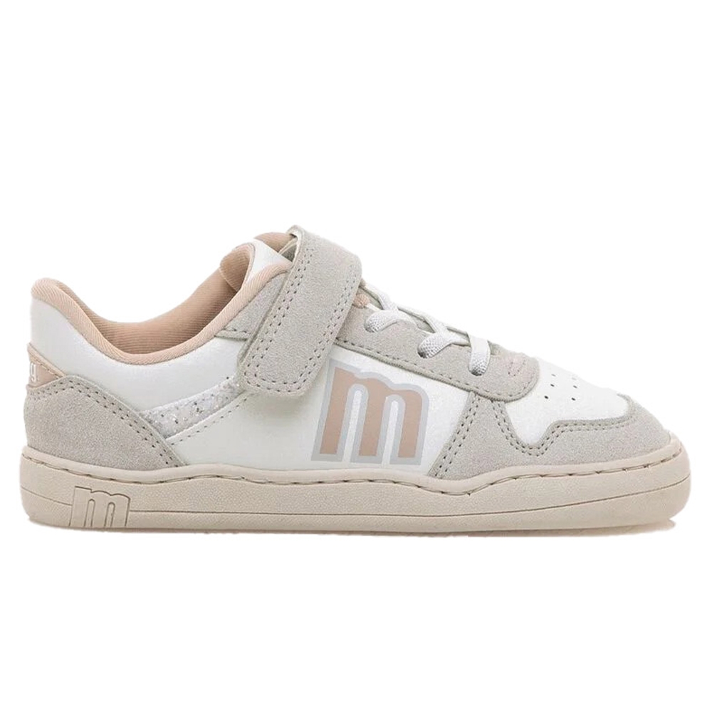Zapatillas de color blanco con detalles en beige y rosa para niña de la marca Mustang, modelo Free. Diseñadas para ofrecer comodidad y estilo con su cierre combinado adhesivo y cordones elásticos, estas zapatillas destacan por su ajuste práctico y su diseño reforzado en la puntera y los laterales. La combinación de colores suaves les da un toque versátil. Diseñada y desarrollada especialmente en colaboración con el Dr. Juanjo López, traumatólogo deportivo e infantil, para respetar el desarrollo natural del pie de los niños. Gracias a su puntera ancha permite el libre movimiento de los dedos dentro del zapato. Su suela tiene 3 mm de grosor y con zero drop (totalmente plana) respeta el natural desarrollo del pie del pequeño y sus elementos flexibles y torsionables hace que el pie del niño no esté encorsetado por la estructura del zapato. Las plantillas extraíbles y las marcas de los dedos en la misma, facilita comprobar si la talla del calzado es la correcta para tu hijo. Además, su fácil apertura facilita que el niño pueda descalzarse y calzarse de forma autónoma. Acompaña los primeros pasos de tu bebé con Mustang. Con certificado VEGANO sellado por INESCOP, el cual garantiza que la naturaleza química principal del material no se corresponde con fibras de origen animal.