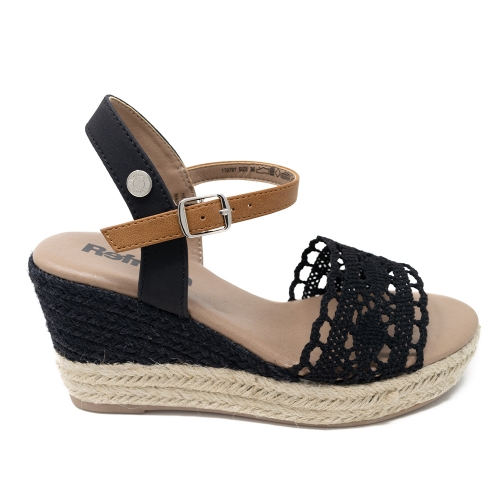 Sandalia de mujer, de la marca Refresh. Fabricada en tejido de ganchillo y material que imita la piel. Diseño de pala y pulsera con hebilla. Cuña de yute de 9 cm con plataforma delantera y suela de goma antideslizante. Un modelo veraniego que combinará con tus looks favoritos. Este modelo ha obtenido el certificado vegano por la organización mundial PETA (Organización de los derechos de los animales).