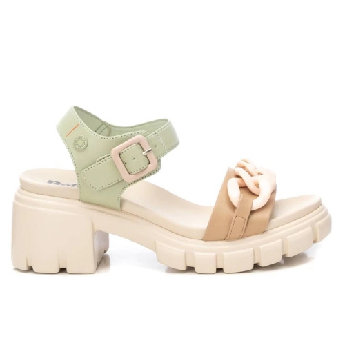 Sandalia de mujer, de la marca Refresh. Fabricada en material que imita la piel. Cadena decorativa en la pala. Pulsera al tobillo con cierre de hebilla. Tacón ancho de 6 cm con plataforma delantera. Suela dentada antideslizante. Este modelo ha obtenido el certificado vegano por la organización mundial PETA (Organización de los derechos de los animales).