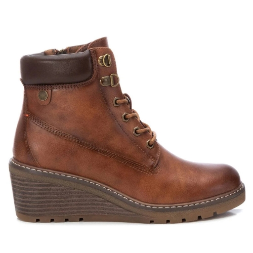 Botín de mujer, de la marca Refresh. Fabricado en un material que imita la piel. Cierre lateral mediante cremallera y cordones ajustables para mayor comodidad. Cómoda cuña de 7 cm para elevar el look de este invierno. Este modelo ha obtenido el certificado vegano por la organización mundial PETA (Organización de los derechos de los animales).