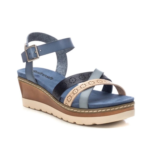 Sandalia de mujer, de la marca Refresh. Fabricada en material que imita a la piel. Diseño de pala multitiras con pulsera que ajusta el tobillo. Cómoda planta acolchada. Cuña de 6 cm con suela de goma antideslizante. Este modelo ha obtenido el certificado vegano por la organización mundial PETA (Organización de los derechos de los animales).