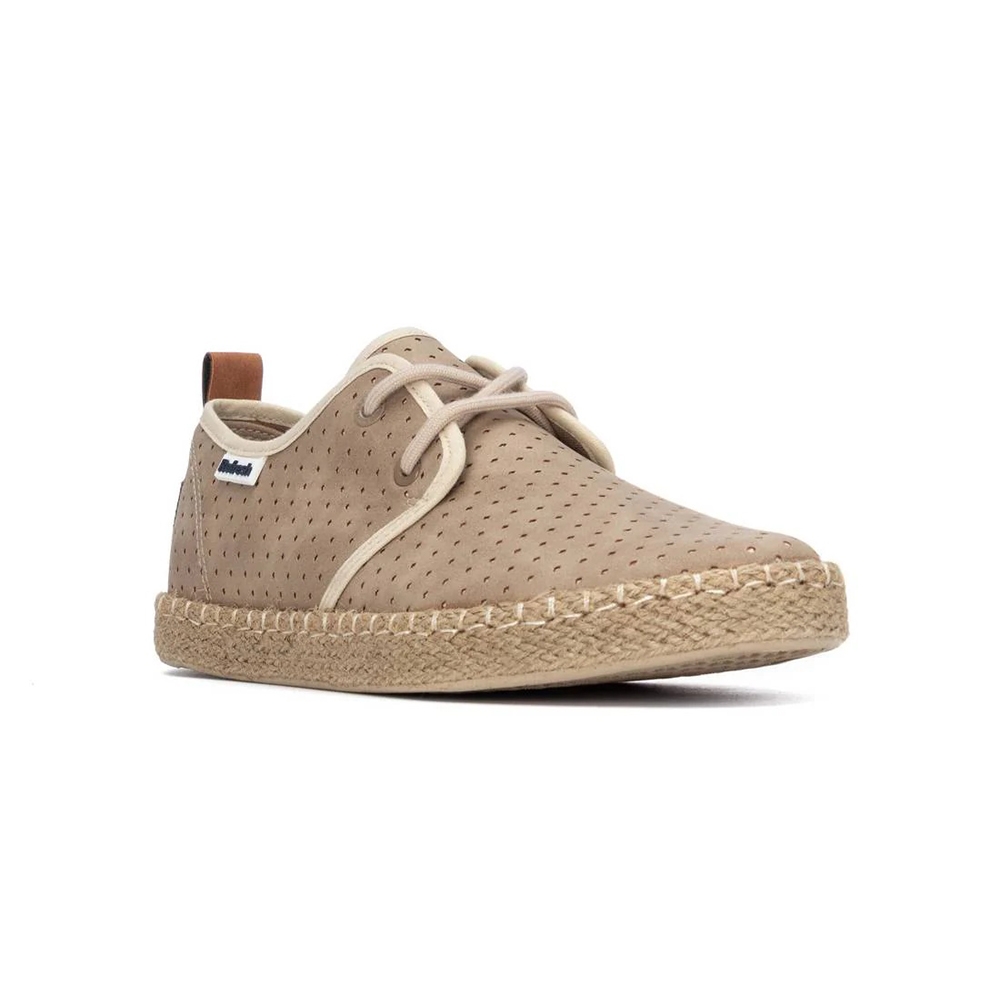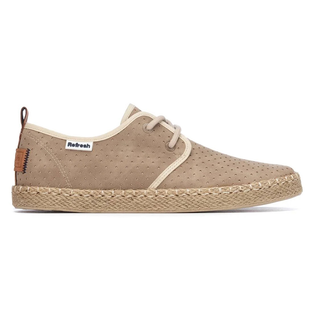 Zapato de hombre, de la marca Refresh. Fabricado en material que imita a la piel con troquel decorativo. Cordones tubulares. Tirador trasero para facilitar la puesta. Piso recubierto de yute con suela de goma. Este modelo ha obtenido el certificado vegano por la organización mundial PETA (Organización de los derechos de los animales).