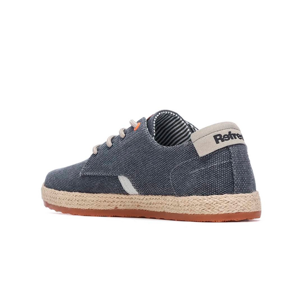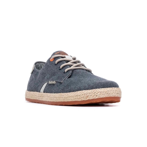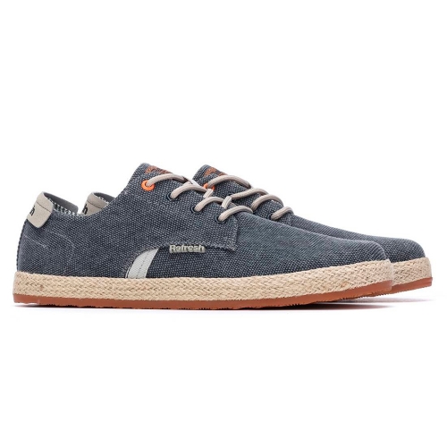 Zapato de hombre, marca Refresh. Fabricado en lona lavada. Cierre de cordones regulables. Entresuela recubierta de yute con suela canalada de goma antideslizante. Este modelo ha obtenido el certificado vegano por la organización mundial PETA (Organización de los derechos de los animales).