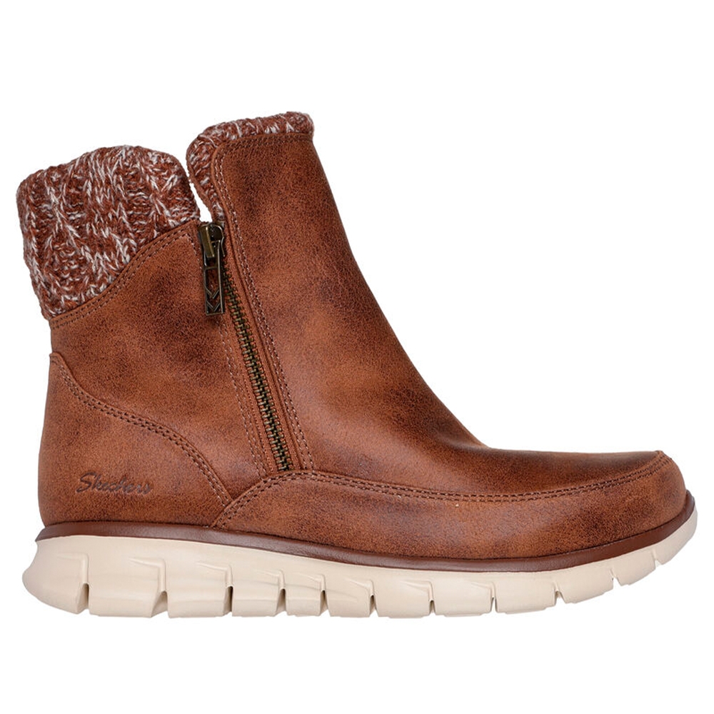 Abrígate bien esta temporada con Skechers Synergy - Lovely Collab. Esta bota con cremallera cuenta con una parte superior de piel vegana tratada con 3M® Scotchgard® con ribete de knit de punto brillante, plantilla Warm Tech Memory Foam y una suela con tracción antideslizante.