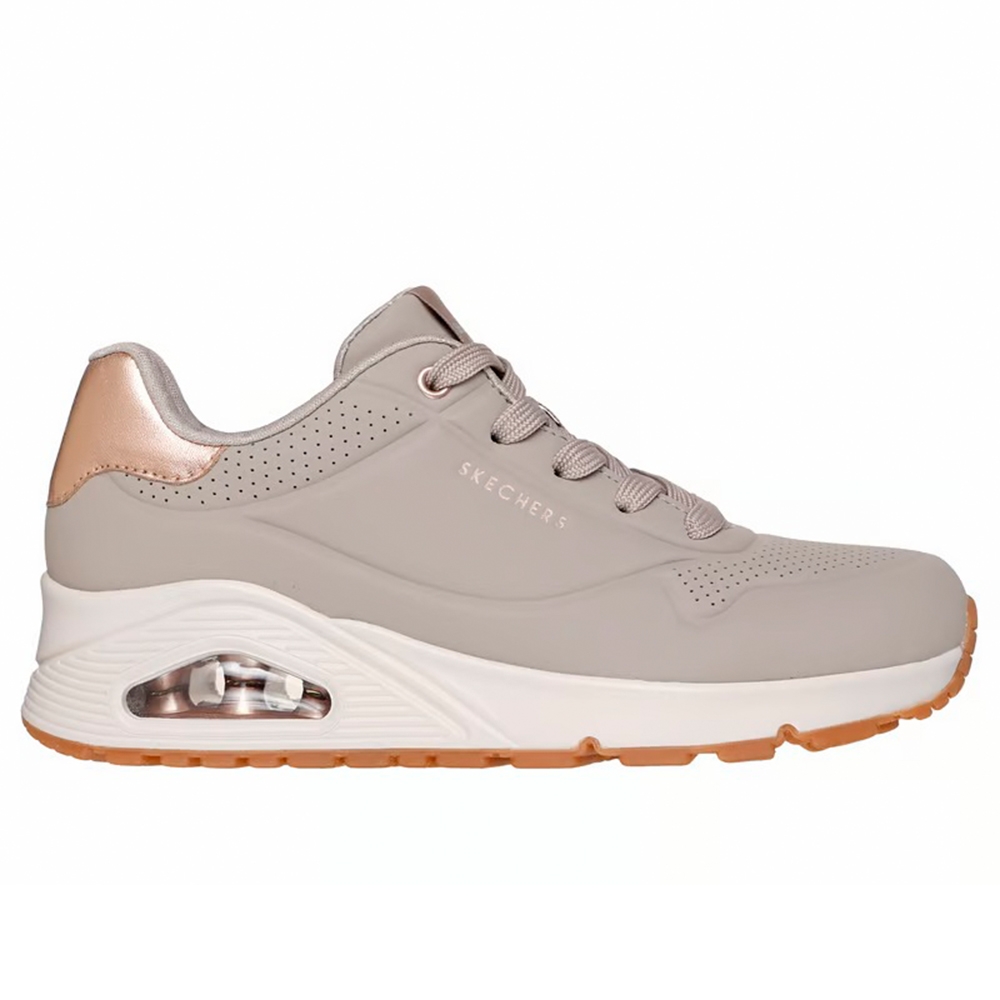 Apuesta por el oro y realza tu estilo con Skechers Street™ Uno - Golden Air. Zapatilla fashion con cordones, parte superior de piel sintética durabuck con acentos dorados, plantilla Skechers Air-Cooled Memory Foam® y media suela visible Skech-Air® con amortiguación y cámara de aire.
