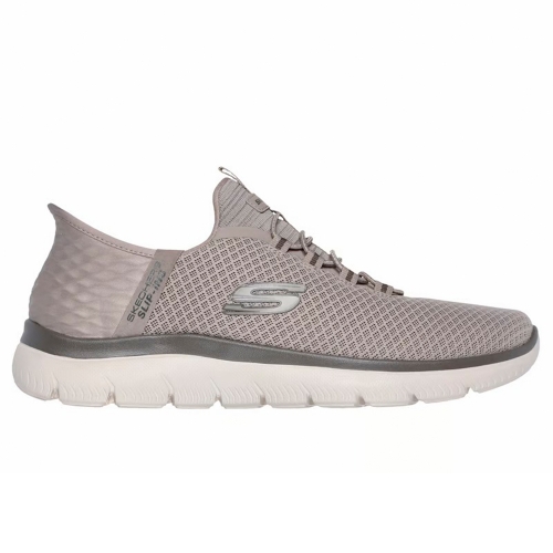 Disfruta de la comodidad de Skechers Hands Free Slip-ins®: Summits - High Range. Junto con nuestro sistema exclusivo Heel Pillow™, que mantiene el pie en su sitio de forma segura, este modelo vegano cuenta con un panel moldeado único en el talón Skechers Slip-ins®, una parte superior de malla con cordones fijos y una plantilla con amortiguación Skechers Air-Cooled Memory Foam®.