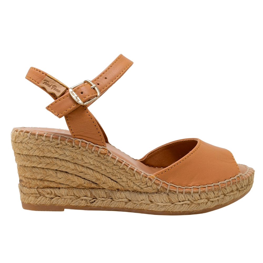 SIA-P. Esta alpargata de cuña con cierre de hebilla se elabora en piel. La cuña de yute tiene una altura de 7 cm, de los cuales 5 cm pertenecen al tacón y 2 cm a la plataforma. La base de la suela es de goma antideslizante. La plantilla interior está forrada en piel de vacuno para mayor confort. Este diseño está cosido a mano en España.La puntera y la talonera son abiertas.