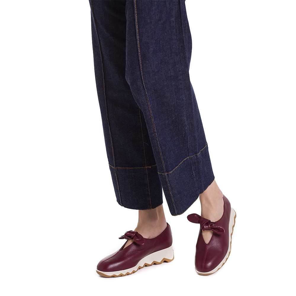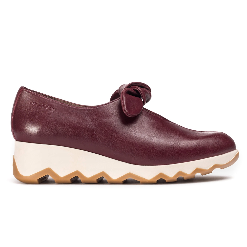 Zapatos SIMÓN 11 confeccionados en piel lisa burdeos. Su diseño minimalista se realza con un coqueto detalle de nudo en el escote, que aporta un toque distintivo y femenino al conjunto. La silueta cerrada y limpia se equilibra con una suela dentada bicolor que proporciona un aire contemporáneo y una pisada segura, desarrollada con tecnología EvoLight, proporciona ligereza y confort, mientras que la plantilla interior extraíble de MemoryGel se adapta perfectamente al pie, proporcionando comodidad en cada pasoWonders apoya la fabricación responsable vía LEATHERWORKINGGROUP.