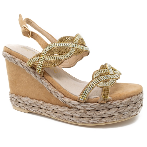 SANDALIA CUÑA DE ESPARTO CON PLATAFORMA Y TIRAS DE PEDRERIA