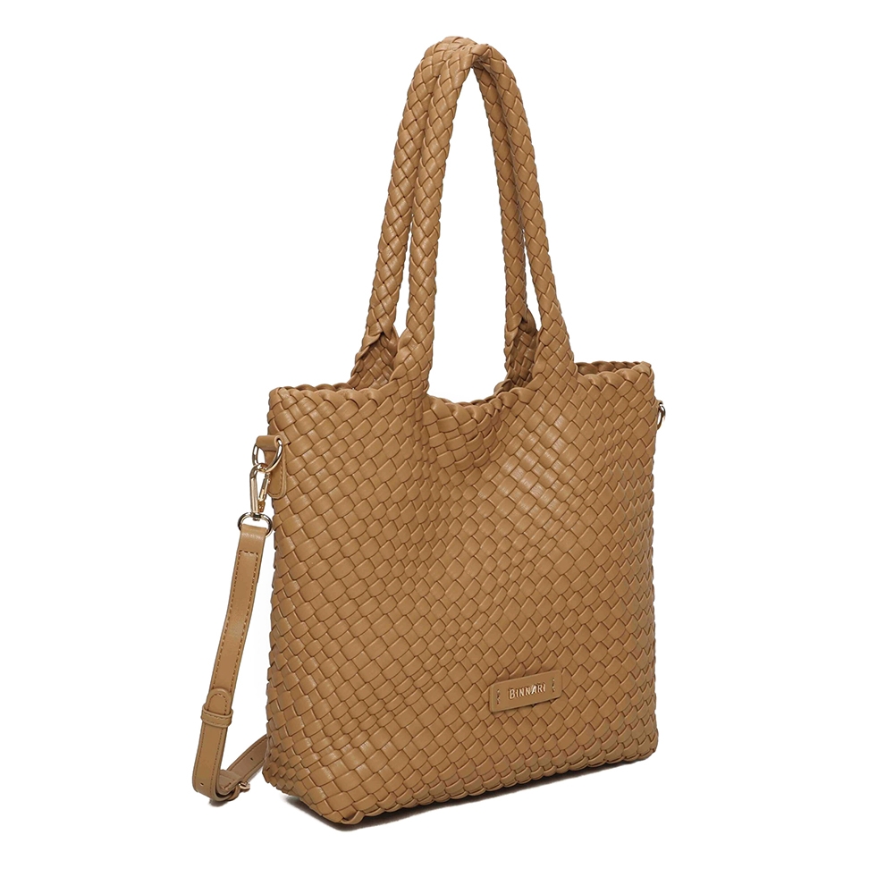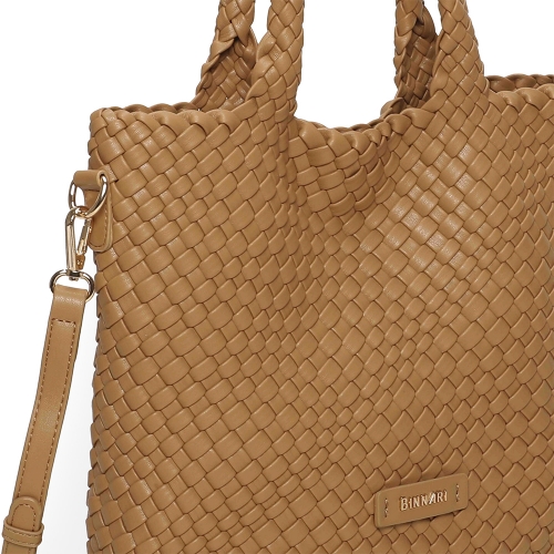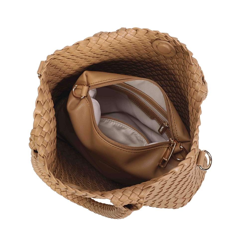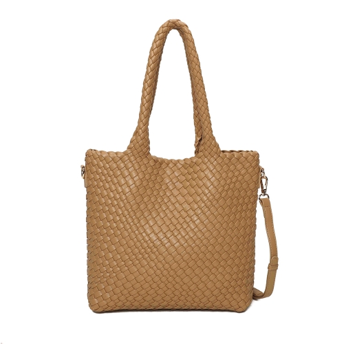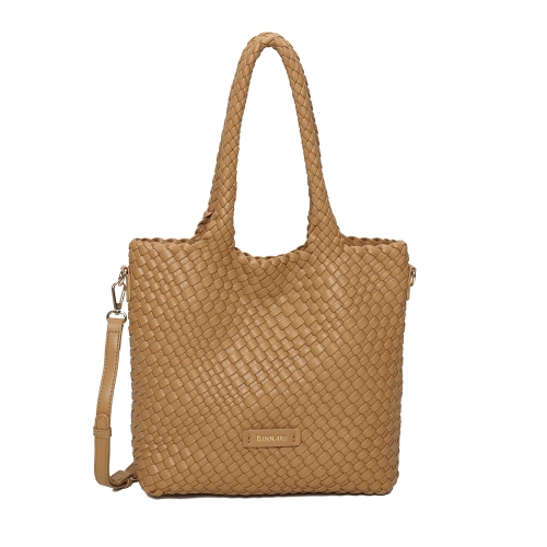 Bolso de tamaño mediano confeccionado en PU trenzado, con un diseño ligero, moderno y muy versátil. Cuenta con dos asas superiores para llevar al hombro y una correa ajustable y removible para usarlo como bandolera cuando lo necesites. Sus detalles metálicos en tono oro claro aportan un acabado elegante. ¡Un accesorio imprescindible para completar tus looks esta temporada!