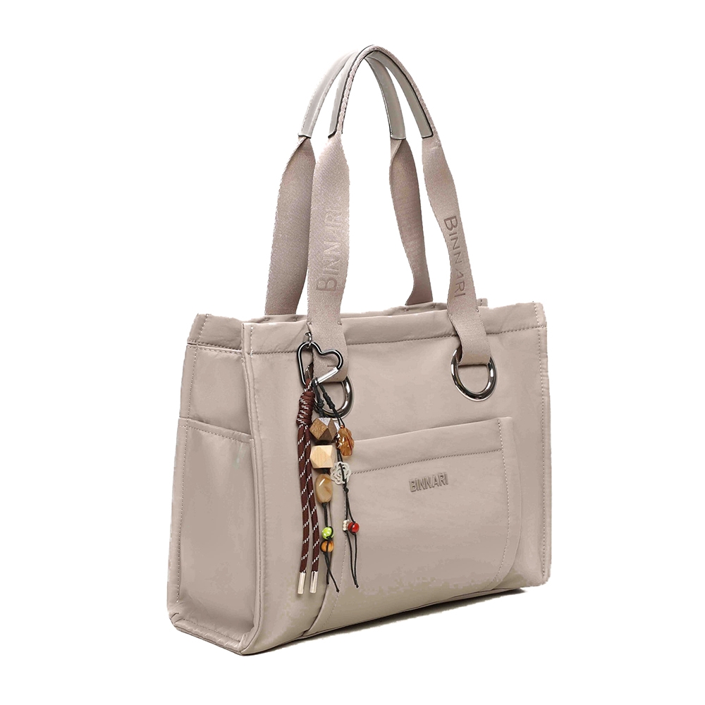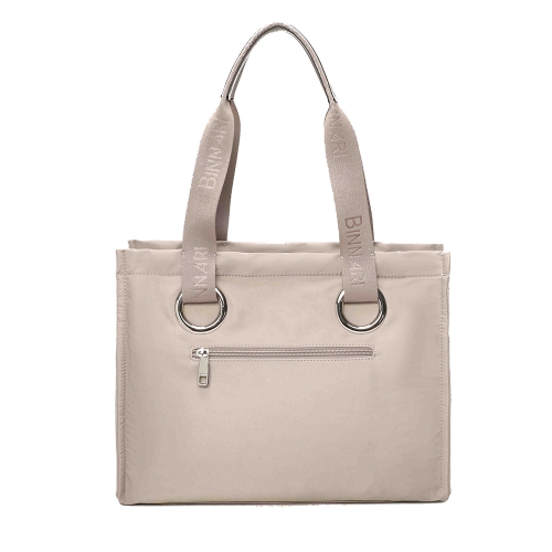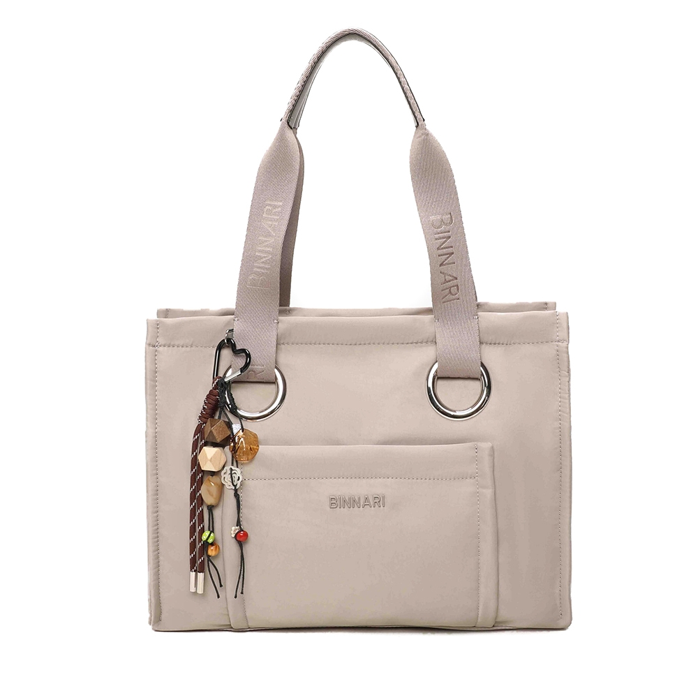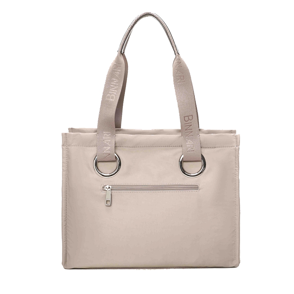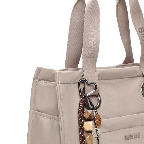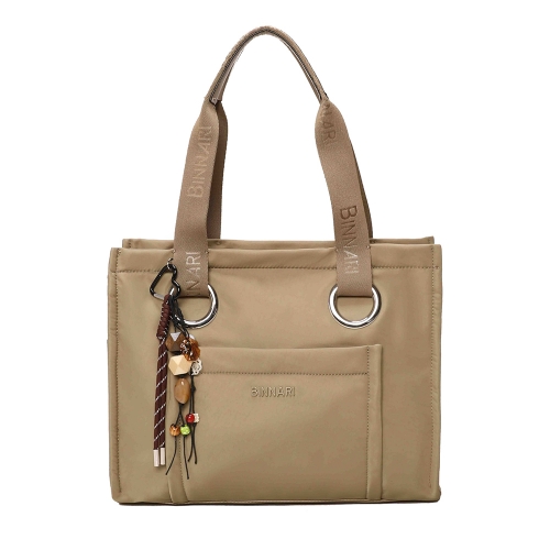 Entre los favoritos de la colección, este bolso se ha convertido en todo un best seller gracias a su ligereza y funcionalidad. Está confeccionado en nylon resistente, con asas anchas decoradas con el nombre de la marca y un detalle decorativo extraíble que aporta personalidad. Su formato es amplio y estructurado, con un bolsillo frontal muy práctico para tener lo esencial a mano. Un modelo cómodo, moderno y perfecto para el día a día.