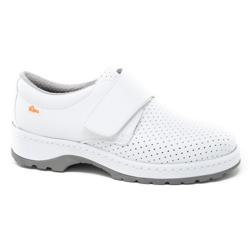 Zapato con cierre de velcro, lavable en frío y caliente hasta 40º, corte de microfibra D’COVER OEKO-TEX® forrada interiormente D’DRY®, altamente TRANSPIRABLE con gran capacidad de absorción de humedad y rápido secado. Horma recta de puntera redondeada. Contrafuerte de dureza suficiente para sujetar el calcáneo. Plantilla acolchada de tejido sobre espuma de poliuretano con tratamiento antibacterias y carbón activado. Suela antibacteriana de poliuretano bicolor, antideslizante de gran coeficiente en seco y húmedo, con resaltes acanalados en la suela para facilitar la evacuación de líquidos. Fabricado mediante montado y cosido de seguridad para reforzar la unión de la suela al corte del zapato.