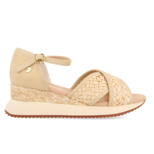 Sandalias deportivas off-white con cuña. Diseño abierto de rafia trenzada y talón con una fina pulsera con hebilla ajustable. Cuña combinada en EVA de colores y forrada en rafia. Plantilla acolchada. Descubre las novedades de las sandalias deportivas mujer de la temporada en la nueva colección de Gioseppo Woman.