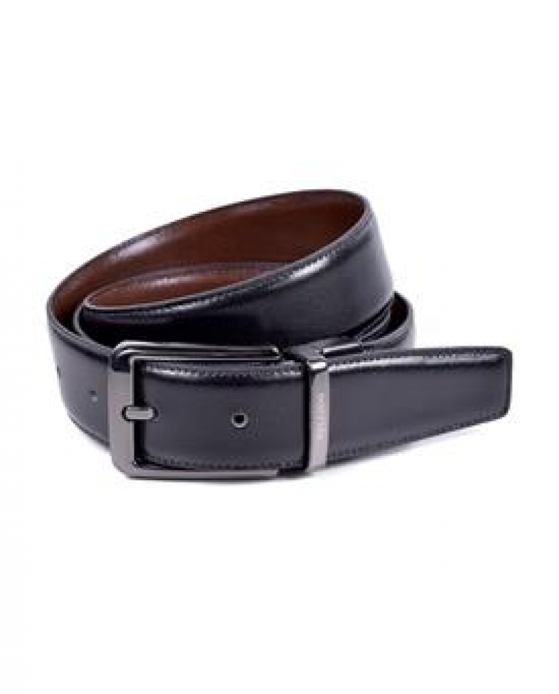 Cinturón en piel lisa de vacuno con sistema reversible. Un simple giro de la hebilla deja a la vista el color elegido. Diseño con pasador metálico, identificado a láser con la marca y hebilla en acabado níquel negro satinado. Este modelo tiene un fácil sistema de corte para adaptar a la medida deseada.