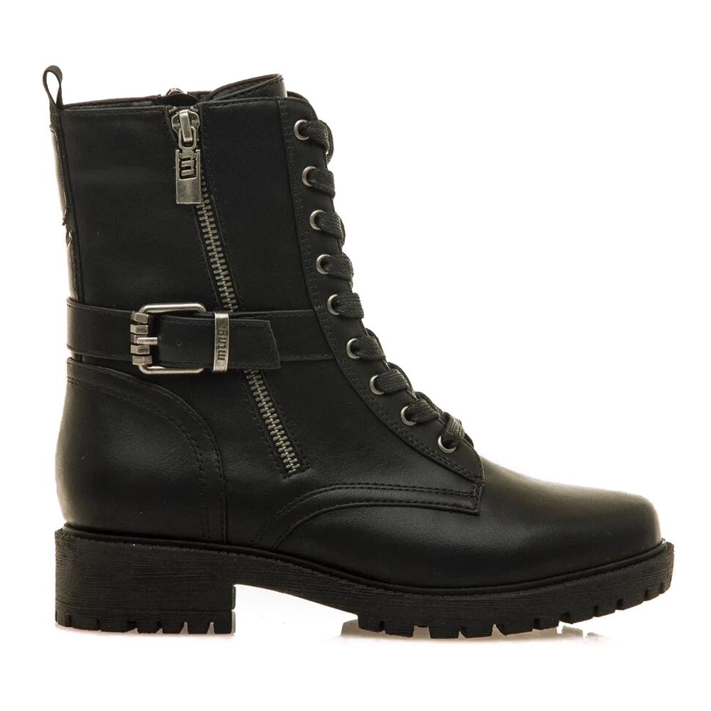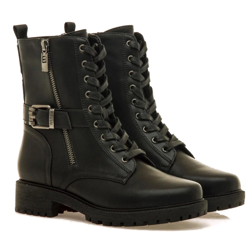 Botín plano Campa Mustang para mujer. De estilo biker urbano de color negro con cierre de cordoneras. Destacan especialmente por su tira en el empeine acabada en una hebilla decorativa. Cierre de cremallera en la parte interior. Tachuela con el logo de la marca. Horma redondeada. Serán la opción perfecta para tu día a día.