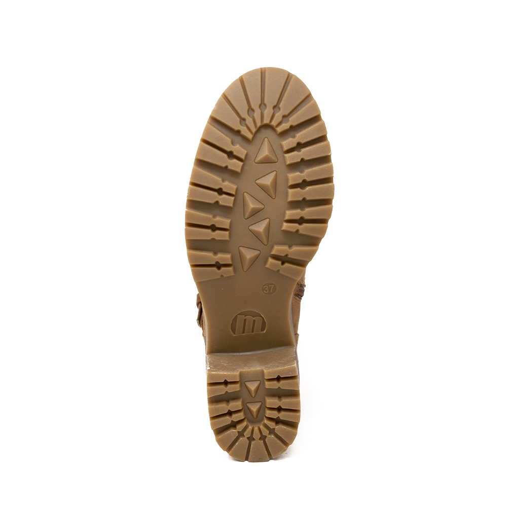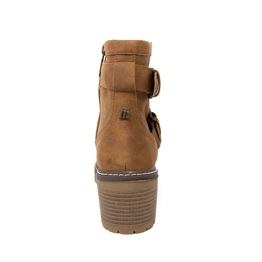 Botín de tacón Doris Mustang para mujer, modelo casual de color taupe de puntera redondeada con adorno de doble hebilla en el empeine y al tobillo. Cierre de cremallera en la parte interior de la caña para más comodidad. Un modelo cómodo por su tacón, ideal para llevar con vaqueros o vestidos, como tu prefieras.
