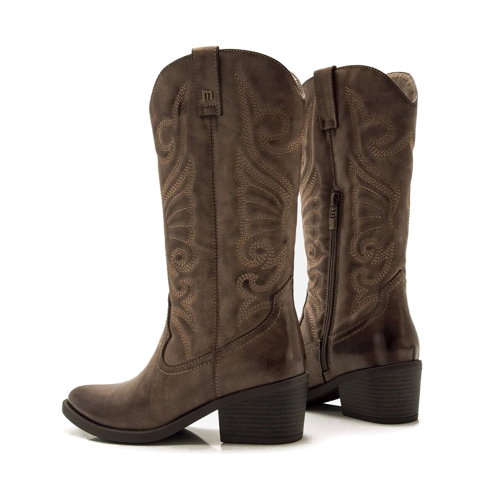 Bota cowboy de color moka para mujer, modelo Tanubis de Mustang. Este diseño de caña media resalta por sus bordados decorativos en hilo claro que contrastan con el acabado desgastado del corte. La puntera ligeramente afilada y el tacón medio ancho aportan un equilibrio entre estilo y comodidad. Con cremallera interior para facilitar el calce y tiradores superiores que refuerzan su estética western, es una opción ideal para darle un aire vaquero a tus looks.
