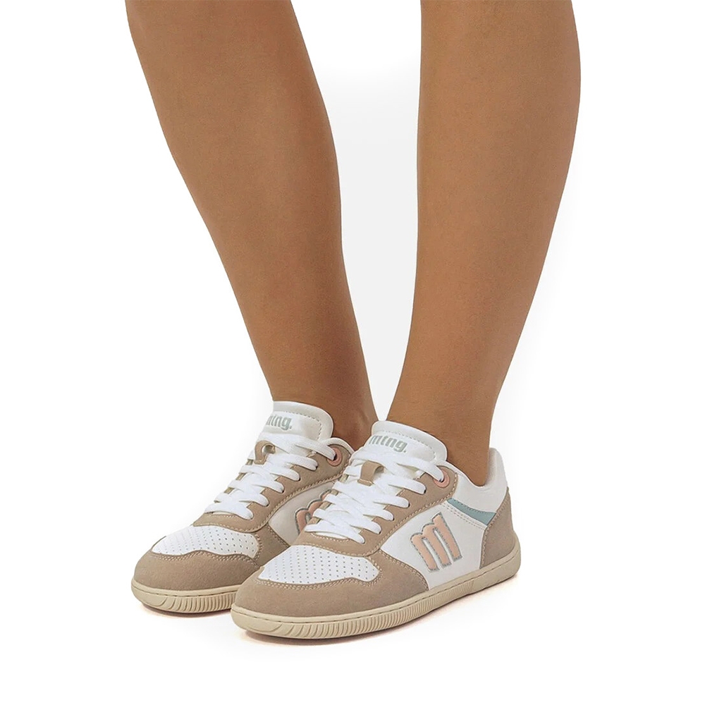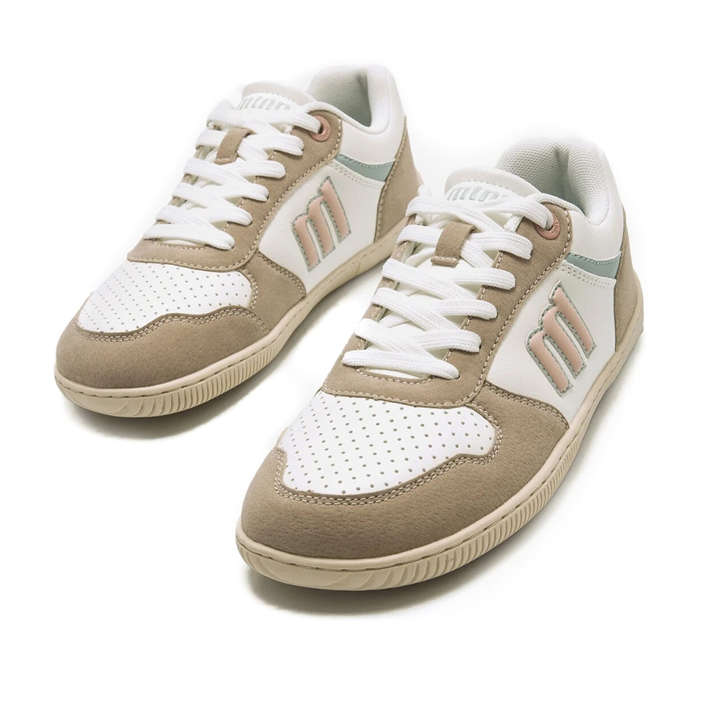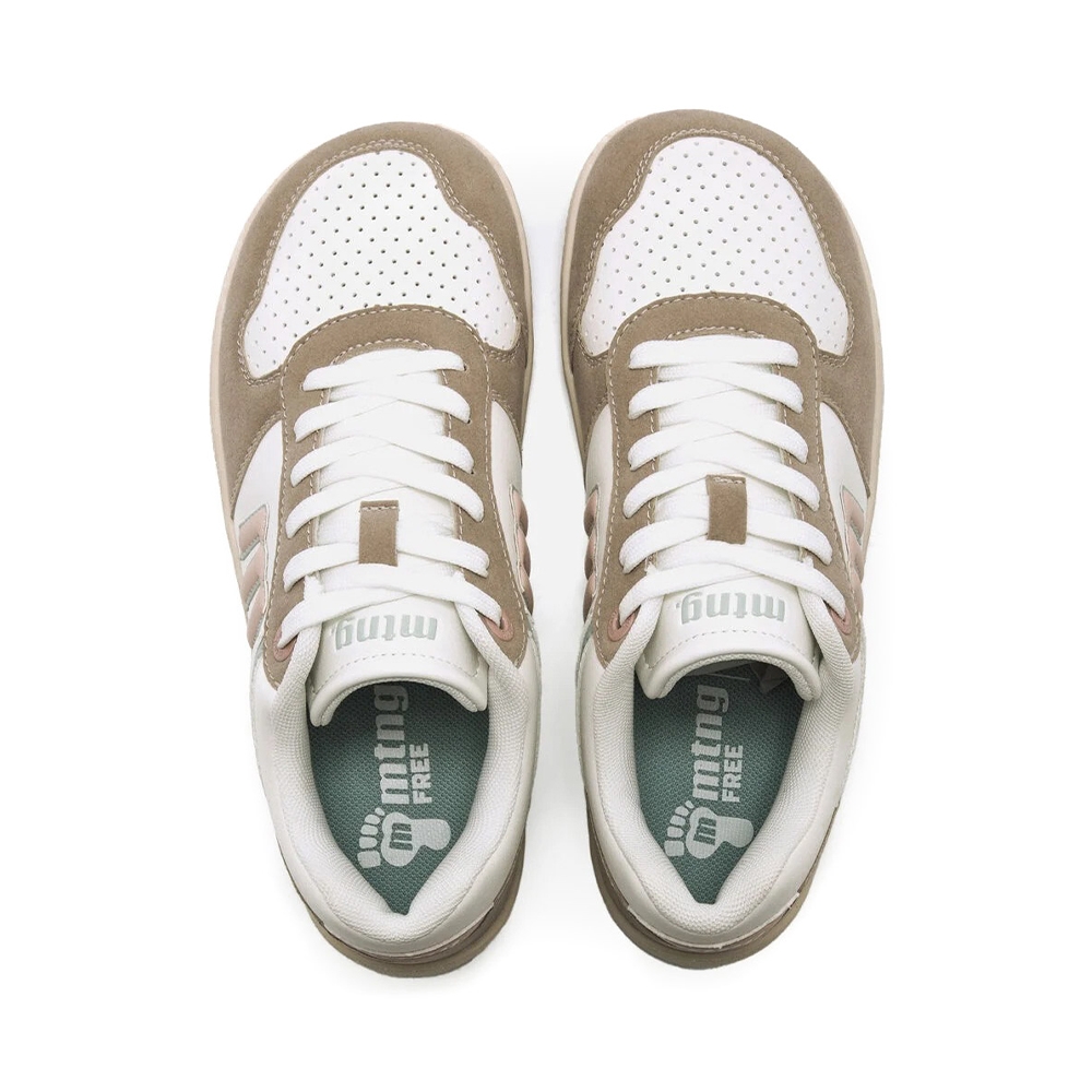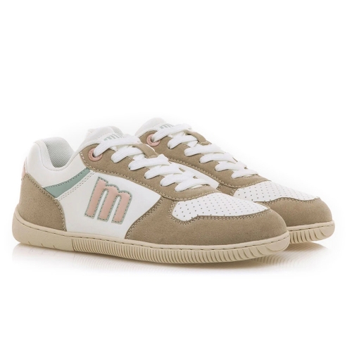 Zapatillas blancas para mujer modelo Free Aria de Mustang. Estas zapatillas destacan por su combinación de tonos beige y blanco, que aportan un estilo fresco y fácil de combinar. El logo de la marca Mustang en el lateral añade un toque distintivo. Diseñadas y desarrolladas especialmente en colaboración con el Dr. Juanjo López, traumatólogo deportivo, para respetar el desarrollo natural del pie. Se trata de un calzado minimalista que gracias a su puntera ancha, suela totalmente plana (cero drop) y flexibilidad, mejora la anatomía del pie y favorece una mejor posición del mismo. Se vende con una plantilla de transición para hacer el cambio de calzado convencional a minimalista de manera progresiva. Certificado por INESCOP como vegano, garantiza que en su fabricación no se han utilizado ningún material de origen animal.
