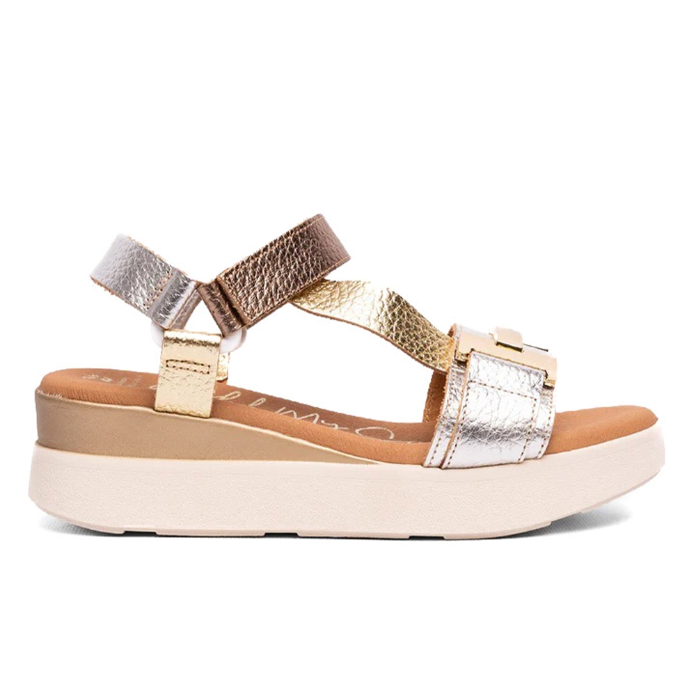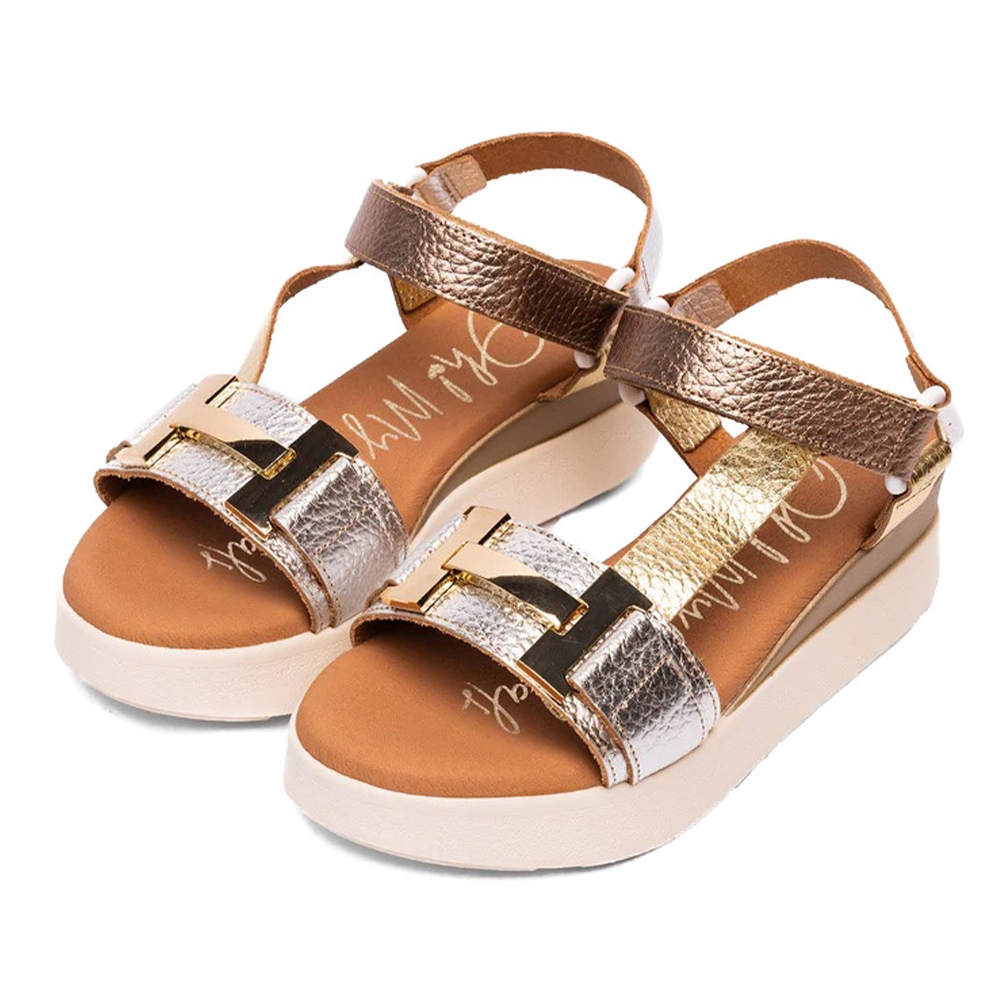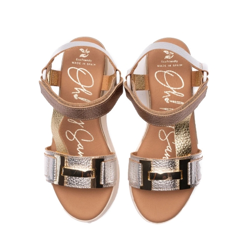 Sandalia de mujer fabricada en piel con plataforma. De estilo californiana, pero destacable por su diversidad de colores metalizados, adorno dorado en pala, detalle dorado en la suela y cierre de velcro para un mayor ajuste y sujeción al pie. El modelo Vania es ideal para cualquier hora del día y ocasión.