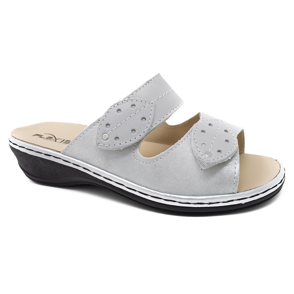 Chancla completamente en piel con plantilla extraíble y cierre con dos velcros ajustables.