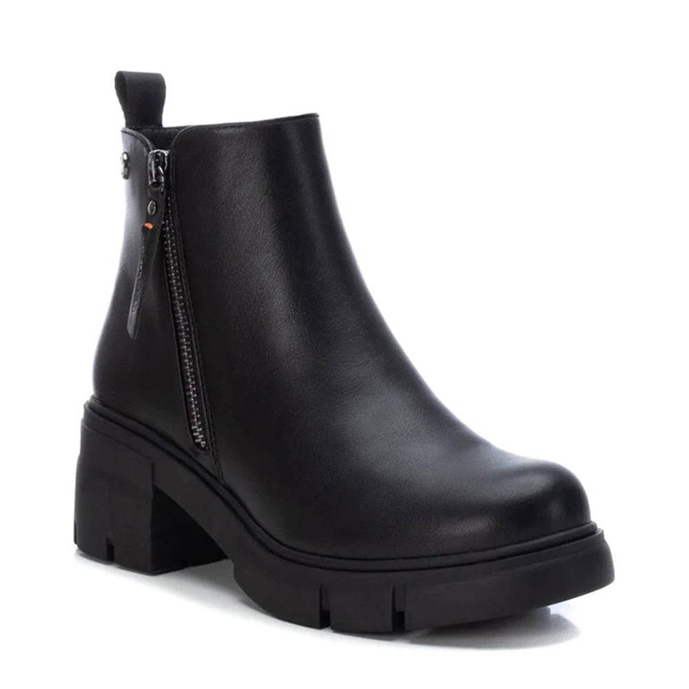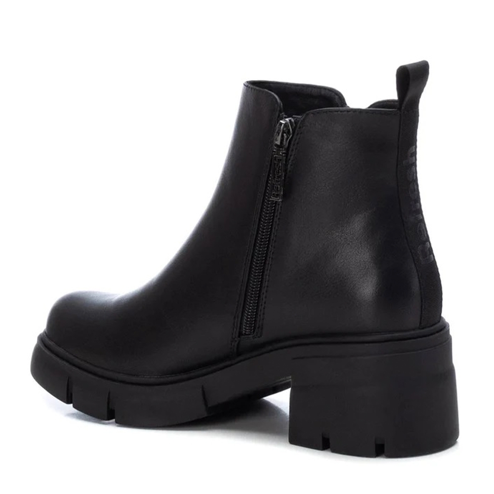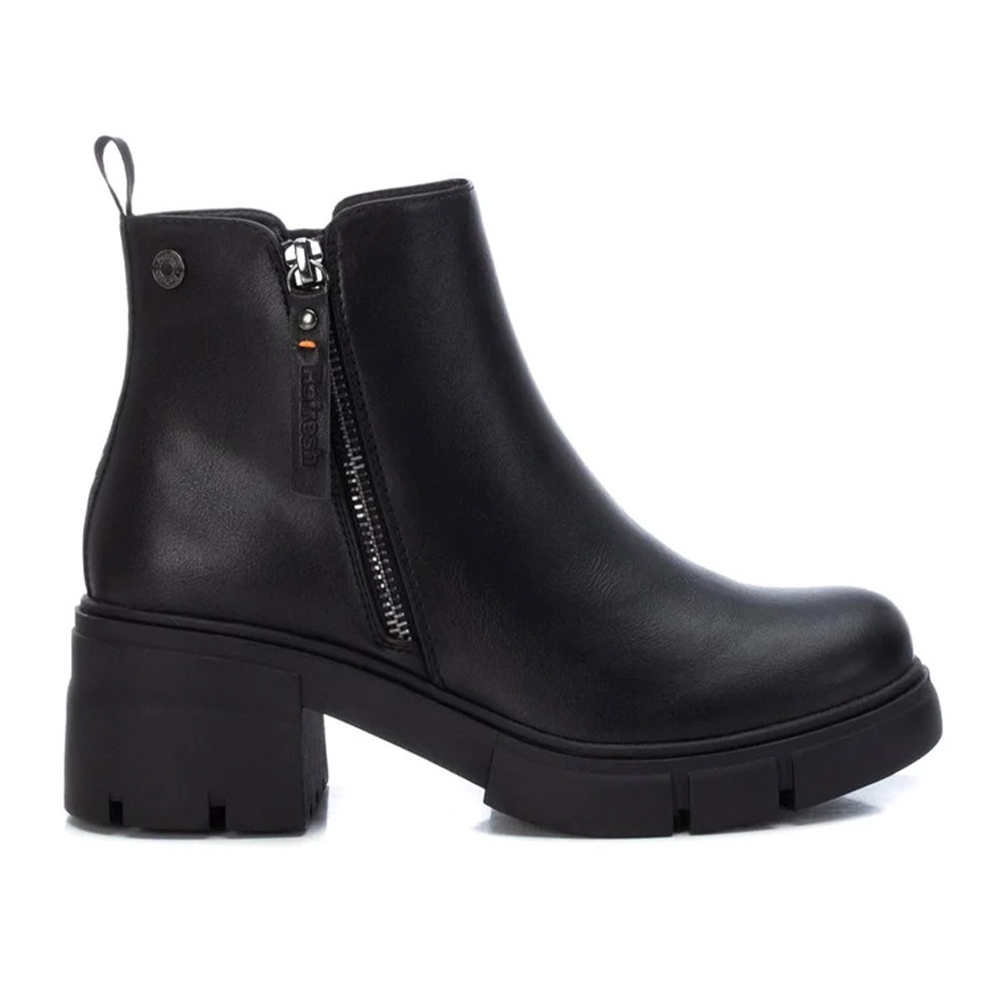 Botín de mujer, de la marca Refresh. Fabricado en material que imita la piel. Cierre mediante cremallera lateral. Tirador trasero para facilitar la puesta. Cremallera decorativa en el lateral exterior. Cómodo tacón ancho de 6 cm con suela de goma antideslizante. Este modelo ha obtenido el certificado vegano por la organización mundial PETA (Organización de los derechos de los animales).