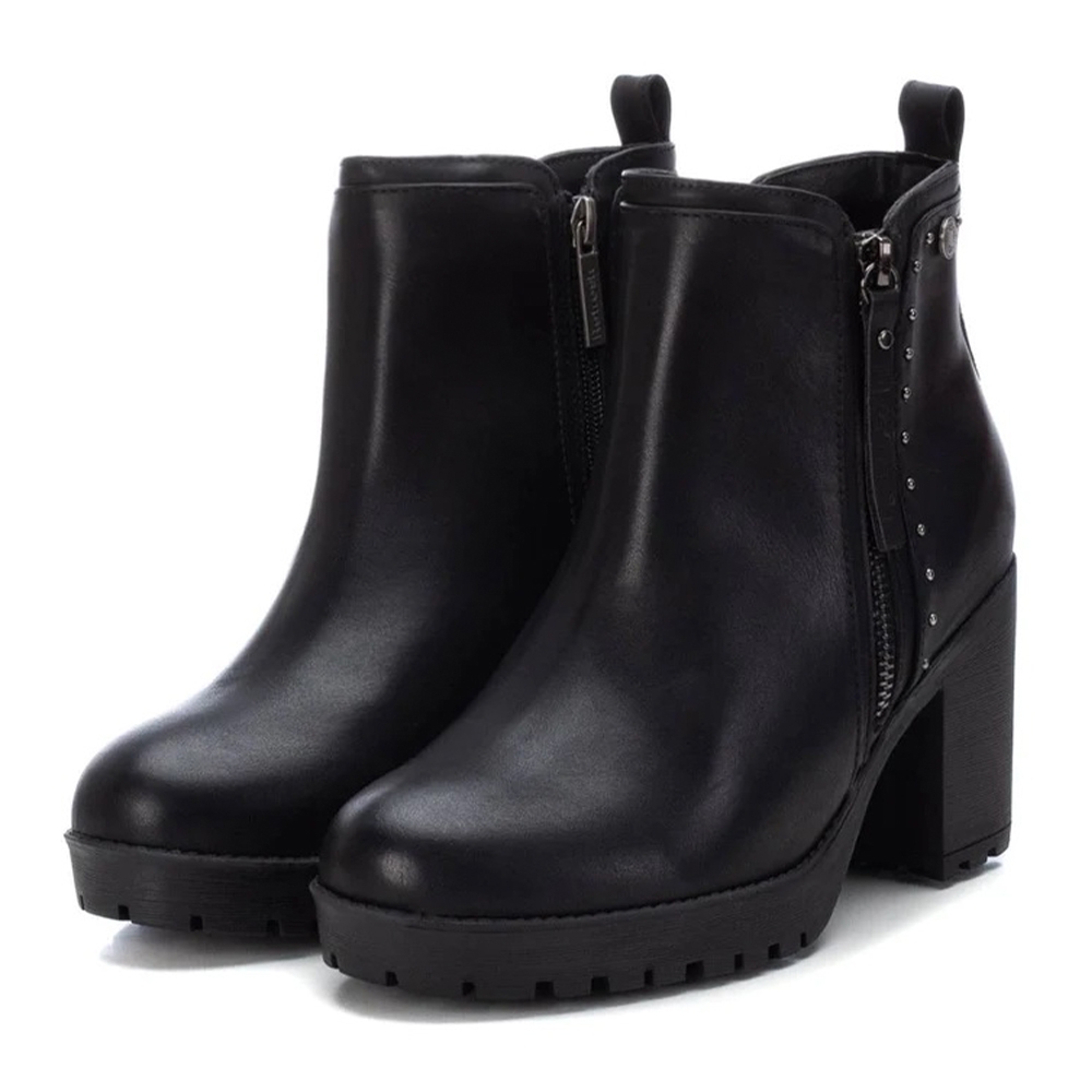 Botín de mujer, de la marca Refresh. Fabricado en material que imita la piel. Cierre mediante cremallera lateral. Tirador trasero para facilitar la puesta. Cremallera decorativa en el lateral exterior y detalle de tachas. Tacón ancho de 8 cm con suela de goma antideslizante. Este modelo ha obtenido el certificado vegano por la organización mundial PETA (Organización de los derechos de los animales).