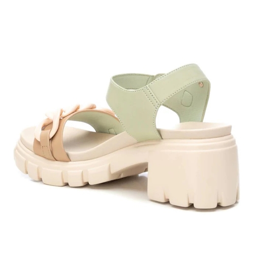 Sandalia de mujer, de la marca Refresh. Fabricada en material que imita la piel. Cadena decorativa en la pala. Pulsera al tobillo con cierre de hebilla. Tacón ancho de 6 cm con plataforma delantera. Suela dentada antideslizante. Este modelo ha obtenido el certificado vegano por la organización mundial PETA (Organización de los derechos de los animales).