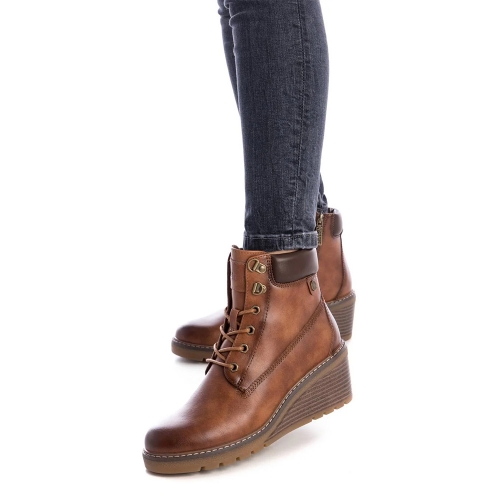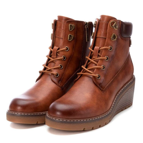 Botín de mujer, de la marca Refresh. Fabricado en un material que imita la piel. Cierre lateral mediante cremallera y cordones ajustables para mayor comodidad. Cómoda cuña de 7 cm para elevar el look de este invierno. Este modelo ha obtenido el certificado vegano por la organización mundial PETA (Organización de los derechos de los animales).