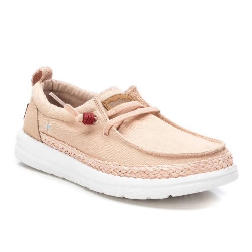 Zapatilla de mujer, de la marca Refresh. Fabricada en lona con acabado metalizado. Ajuste mediante cordones elásticos. Cómoda suela flexible y ligera de goma antideslizante. Con plantilla extraíble. Este modelo ha obtenido el certificado vegano por la organización mundial PETA (Organización de los derechos de los animales).