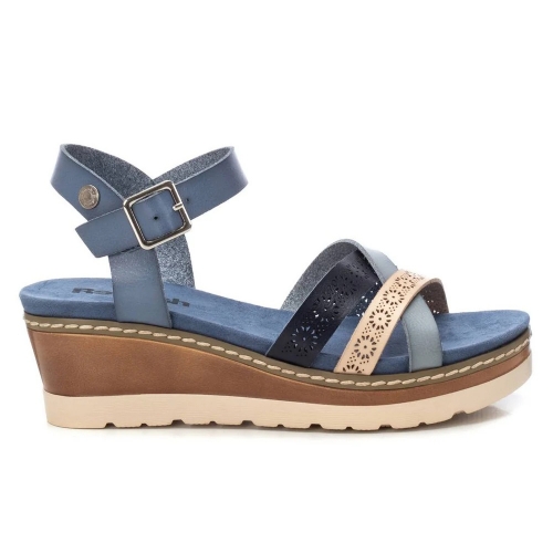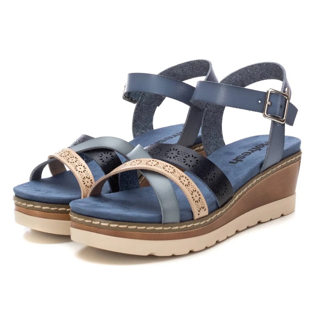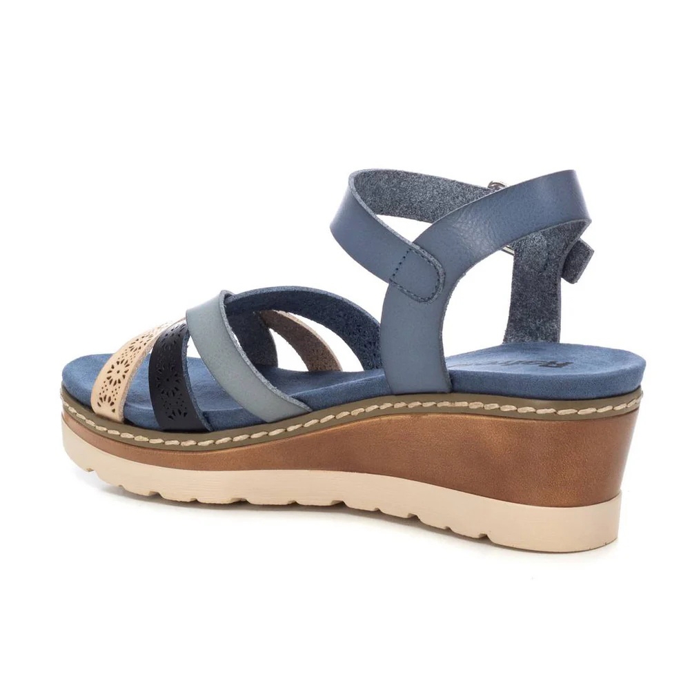 Sandalia de mujer, de la marca Refresh. Fabricada en material que imita a la piel. Diseño de pala multitiras con pulsera que ajusta el tobillo. Cómoda planta acolchada. Cuña de 6 cm con suela de goma antideslizante. Este modelo ha obtenido el certificado vegano por la organización mundial PETA (Organización de los derechos de los animales).