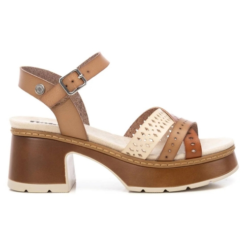 Sandalia de mujer, de la marca Refresh. Fabricada en material que imita a la piel. Pala multitiras combinadas con diferentes troqueles. Pulsera trasera para ajustar al tobillo. Cierre mediante hebilla. Cómoda planta. Tacón de 6 cm con plataforma para mayor comodidad. Suela de goma antideslizante. Este modelo ha obtenido el certificado vegano por la organización mundial PETA (Organización de los derechos de los animales).