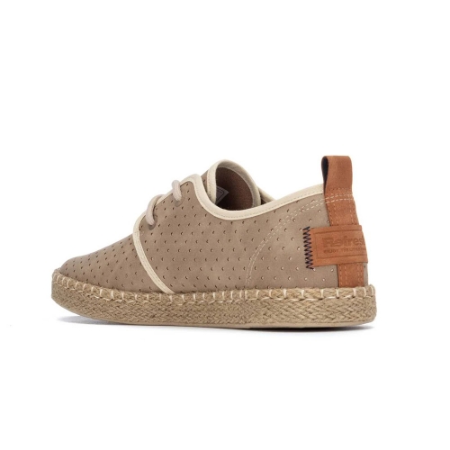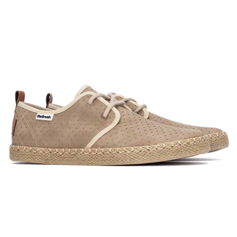 Zapato de hombre, de la marca Refresh. Fabricado en material que imita a la piel con troquel decorativo. Cordones tubulares. Tirador trasero para facilitar la puesta. Piso recubierto de yute con suela de goma. Este modelo ha obtenido el certificado vegano por la organización mundial PETA (Organización de los derechos de los animales).
