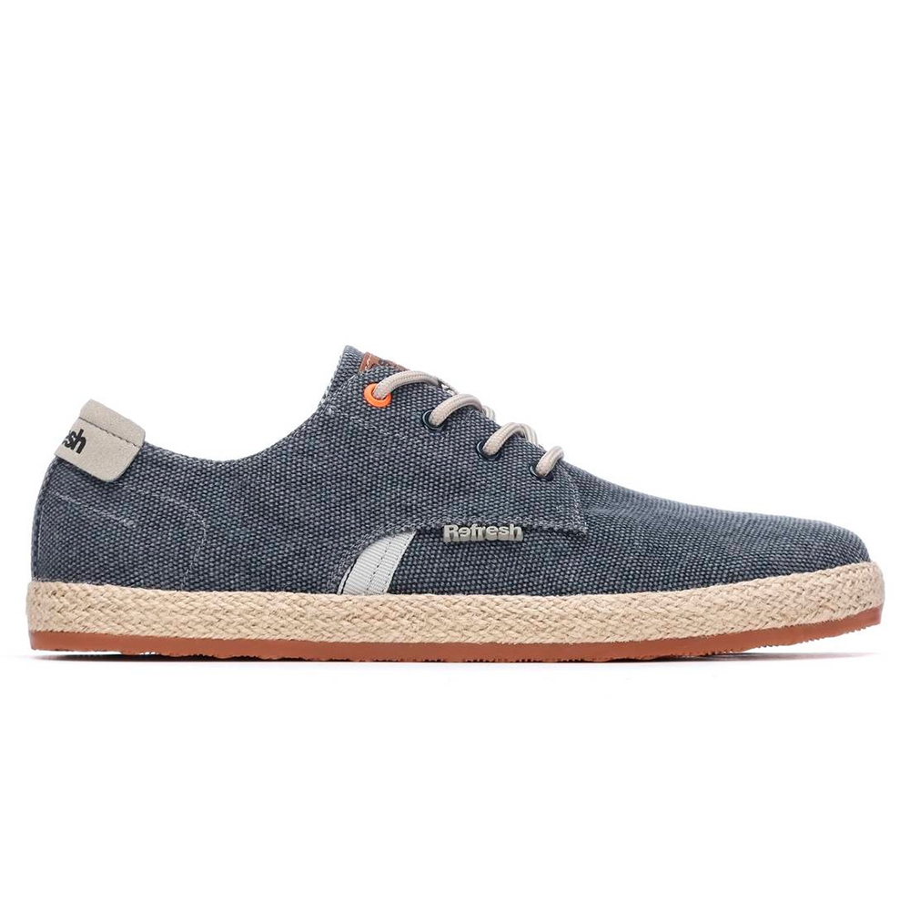 Zapato de hombre, marca Refresh. Fabricado en lona lavada. Cierre de cordones regulables. Entresuela recubierta de yute con suela canalada de goma antideslizante. Este modelo ha obtenido el certificado vegano por la organización mundial PETA (Organización de los derechos de los animales).