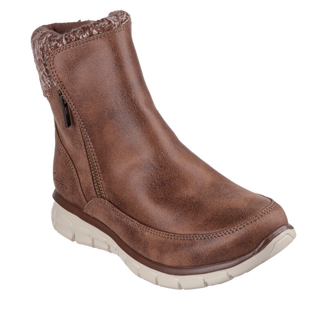Abrígate bien esta temporada con Skechers Synergy - Lovely Collab. Esta bota con cremallera cuenta con una parte superior de piel vegana tratada con 3M® Scotchgard® con ribete de knit de punto brillante, plantilla Warm Tech Memory Foam y una suela con tracción antideslizante.