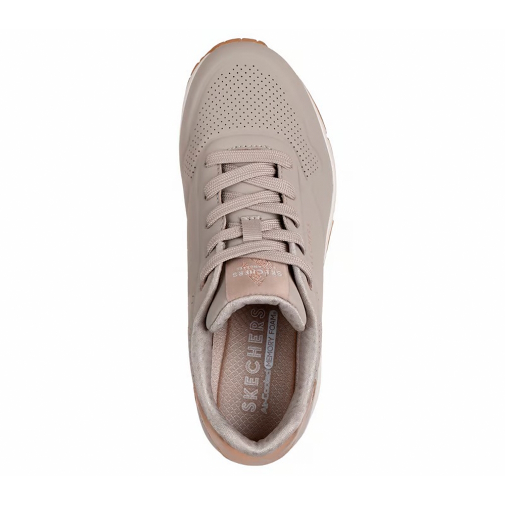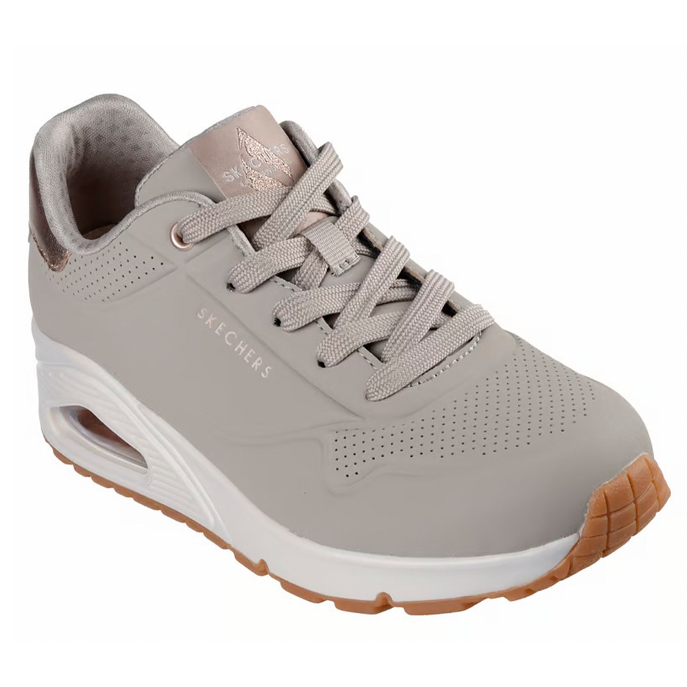 Apuesta por el oro y realza tu estilo con Skechers Street™ Uno - Golden Air. Zapatilla fashion con cordones, parte superior de piel sintética durabuck con acentos dorados, plantilla Skechers Air-Cooled Memory Foam® y media suela visible Skech-Air® con amortiguación y cámara de aire.