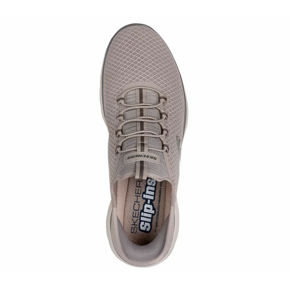 Disfruta de la comodidad de Skechers Hands Free Slip-ins®: Summits - High Range. Junto con nuestro sistema exclusivo Heel Pillow™, que mantiene el pie en su sitio de forma segura, este modelo vegano cuenta con un panel moldeado único en el talón Skechers Slip-ins®, una parte superior de malla con cordones fijos y una plantilla con amortiguación Skechers Air-Cooled Memory Foam®.