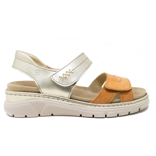 Sandalia doble velcro delantero y empeine con bordado en beige. Combinado en piel natural azul y metalizado oro. Plantilla extraíble, anatómica y lavable en piel. Piso Mostar con una altura aprox. de 4’5 cms.
