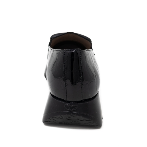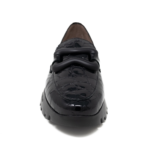 Mocasín piel charol grabada color negro. Modelo con cadena al tono.Plantilla MemoryGel extraíble. Suela maxi desarrollada con tecnología WondersFly ™ garantía de ligereza y confort . Prepárate para la sensación, YES WE FLY.