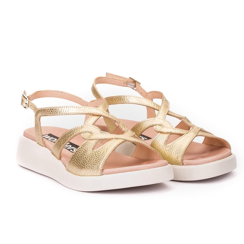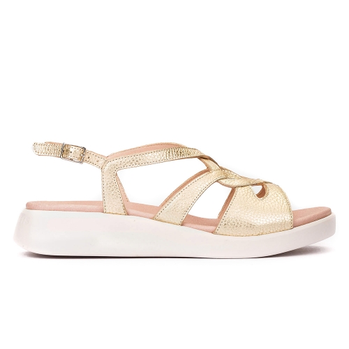 Sandalias planas MAR 50 fabricadas en piel metalizada acabado oro. Su empeine se construye a partir de tiras cruzadas que envuelven el pie con suavidad, el modelo incorpora cierre mediante hebilla lateral para una sujeción precisa y estable. Su suela, creada con tecnología WondersFly™ by XL EXTRALIGHT®, garantiza una ligereza excepcional y un confort extraordinario. Además, la plantilla interior de MemoryGel se adapta perfectamente al pie, proporcionando comodidad en cada paso. Prepárate para sentir la sensación #YesWeFly. Wonders apuesta por una fabricación responsable avalada por LEATHERWORKINGGROUP.