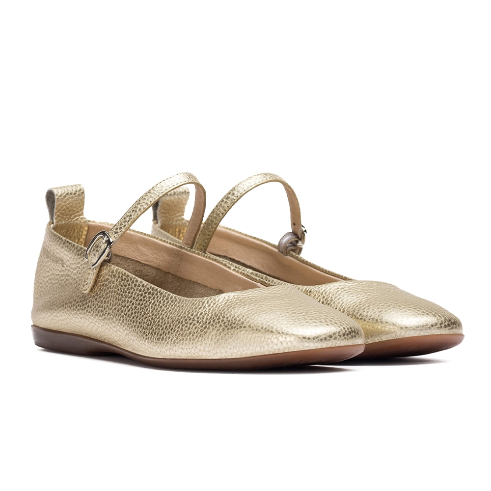 Mercedita plana de piel metalizada color platino. Un diseño contemporaneo de punta cuadrada, con tira trasera para un mejor calce y cierre mediante tira delantera con cierre ajustable.Su plantilla Memory Gel proporciona un extra de comodidad, asegurando confort a lo largo del día. Añade elegancia a tus pasos con nuestra bailarina Seúl.