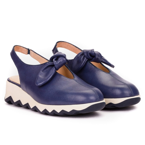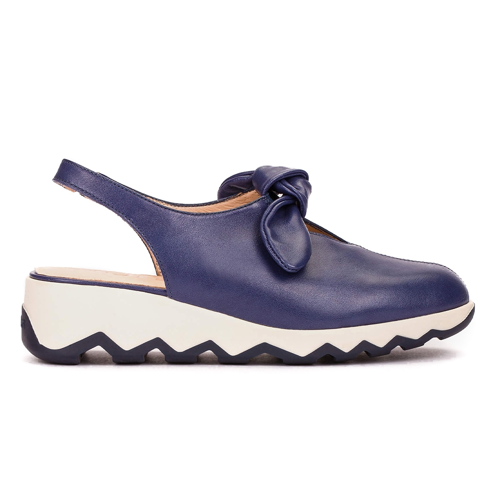 Zapatos destalonados SIMON 02, fabricados en piel lisa azul marino. Este diseño atemporal destaca por su delicado lazo en la parte delantera y un elástico en la tira trasera que asegura un ajuste perfecto. Su suela dentada con acabado bicolor, desarrollada con tecnología EvoLight, proporciona ligereza y confort, mientras que la plantilla interior de MemoryGel garantiza comodidad excepcional. Wonders apoya la sostenibilidad avalada por LEATHERWORKINGGROUP.