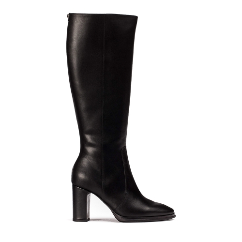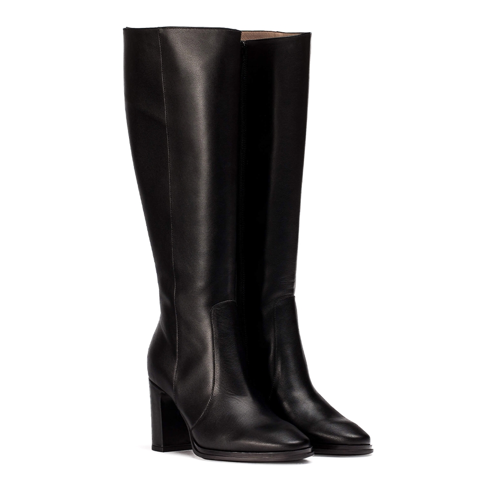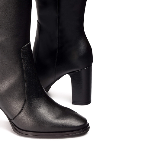Botas TREZE 50 fabricadas en piel lisa negra. Este diseño elegante y atemporal destaca por su silueta estilizada y por una puntera ligeramente afilada que aporta sofisticación y alarga visualmente el pie. La caña alta, limpia y sin costuras superfluas, refuerza su estética minimalista, mientras que el cierre mediante cremallera interior garantiza un calce cómodo y práctico. Su tacón ancho forrado añade estabilidad sin renunciar a la altura, convirtiéndola en una opción versátil tanto para estilismos formales como para looks de diario. Su tacón cuadrado y su suela de goma flexible aportan un extra de comodidad, combinado con la plantilla interior de MemoryGel que asegura una pisada amortiguada en cada paso. #madewithloveinSpain Wonders apoya la fabricación responsable vía LEATHERWORKINGGROUP.