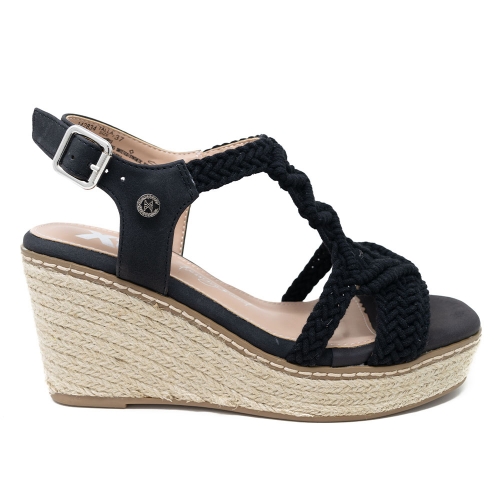 Sandalia de mujer, de la marca Xti. Fabricada en tejido estilo macramé. Cierre mediante hebilla al tobillo. Cuña de 8 cm con plataforma delantera forrada en yute trenzado. Suela de goma antideslizante. Este modelo ha obtenido el certificado vegano por la organización mundial PETA (Organización de los derechos de los animales).