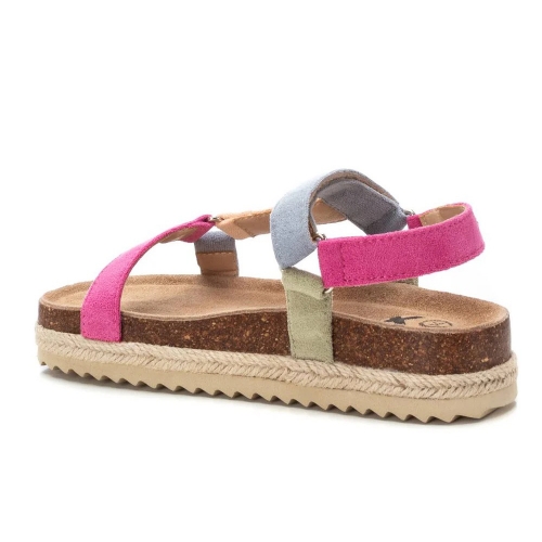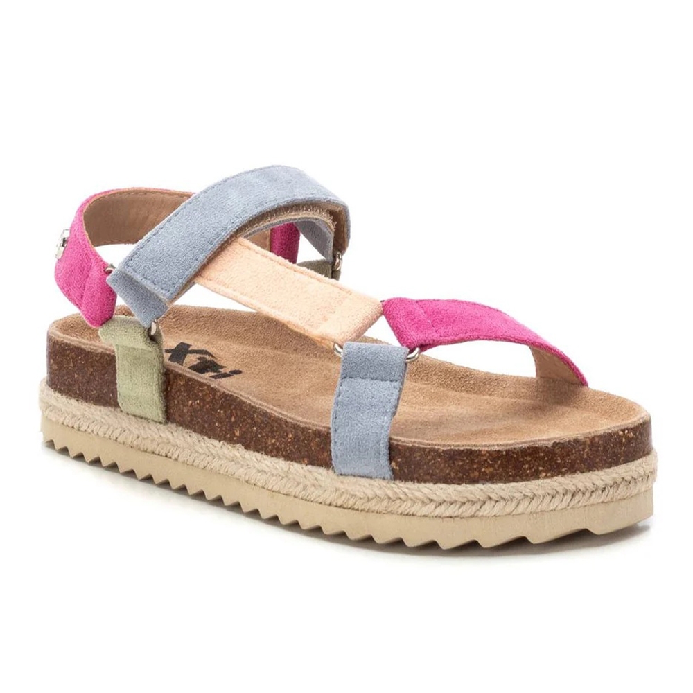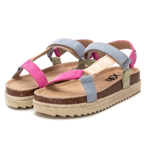 Sandalia multicolor de niña, de la marca Xti Kids. Fabricada en una suave antelina. Cierre mediante tira adherente. Plataforma rodeada por tira de yute con suela de goma antideslizante. Una sandalia ideal para completar tus looks más veraniegos esta temporada.